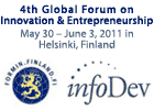 infoDev у співпраці з урядом Фінляндії проводить Четвертий Глобальний Форум з інновацій та підприємництва, який відбудеться в Гельсінкі (Фінляндія) 30 травня - 3 червня 2011 року. У форумі візьмуть участь близько 350 підприємців, менеджерів бізнес-інкубаторів, політиків і експертів з фінансових питань.